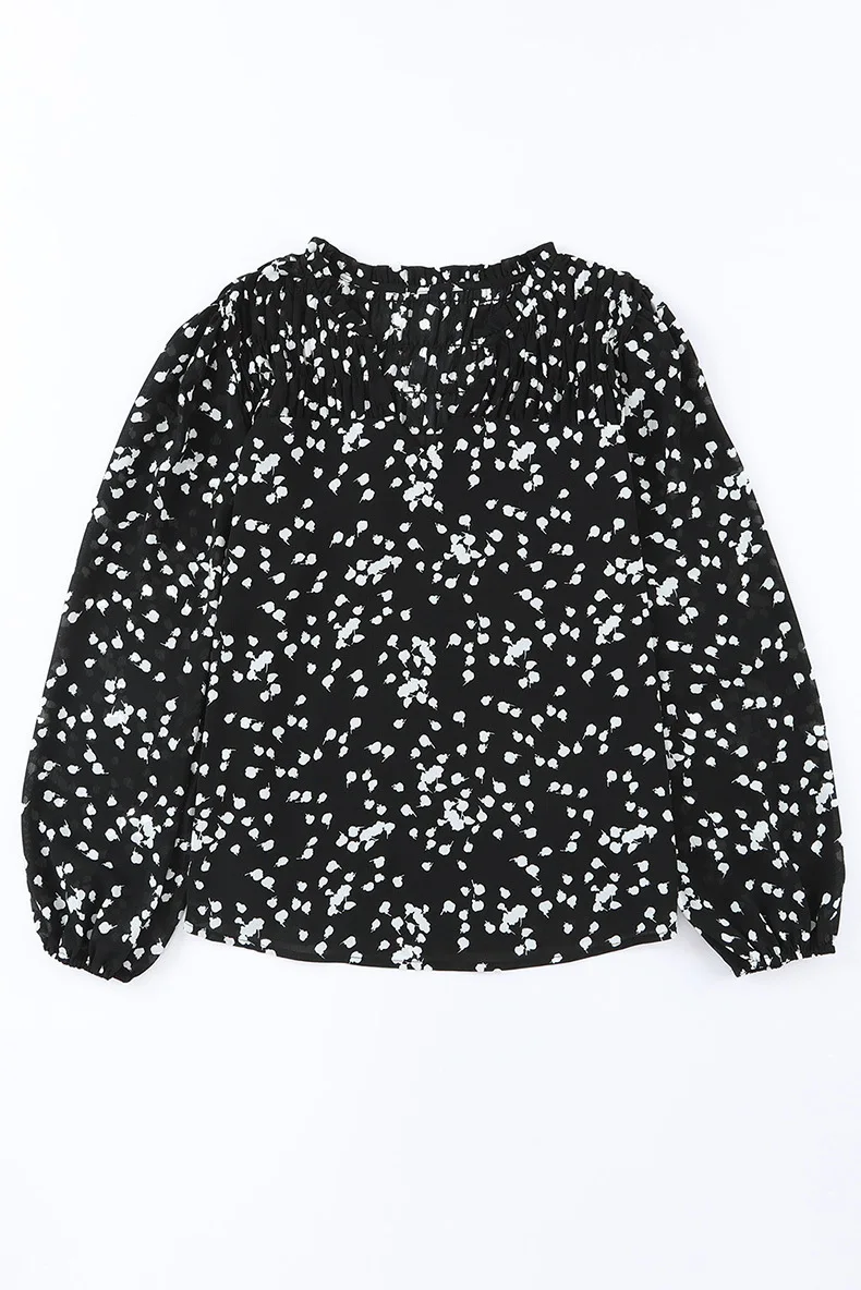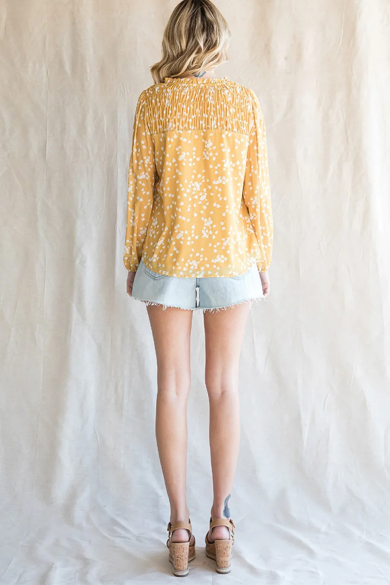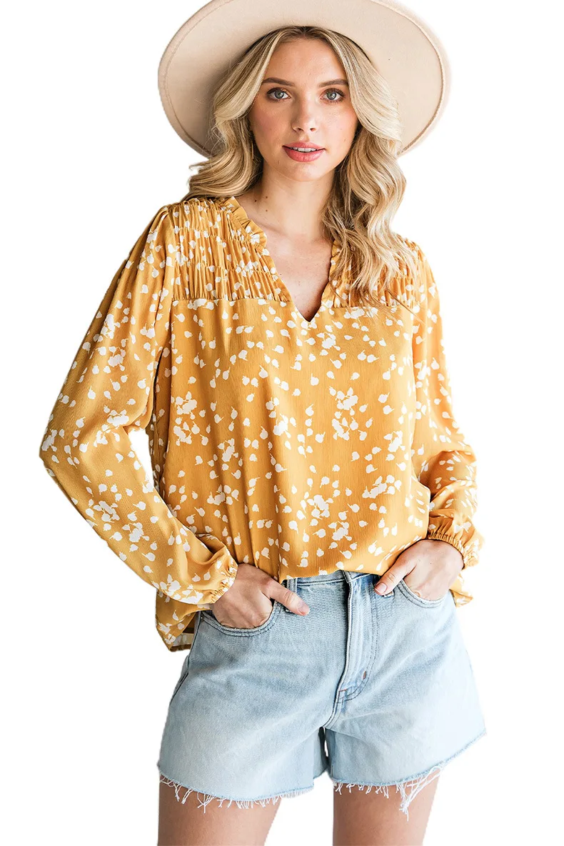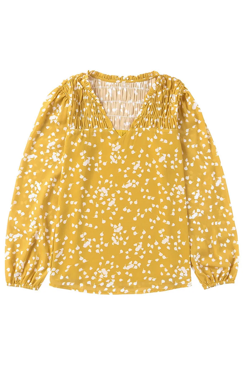 Gul romantisk trykk rynket chiffonskjorte