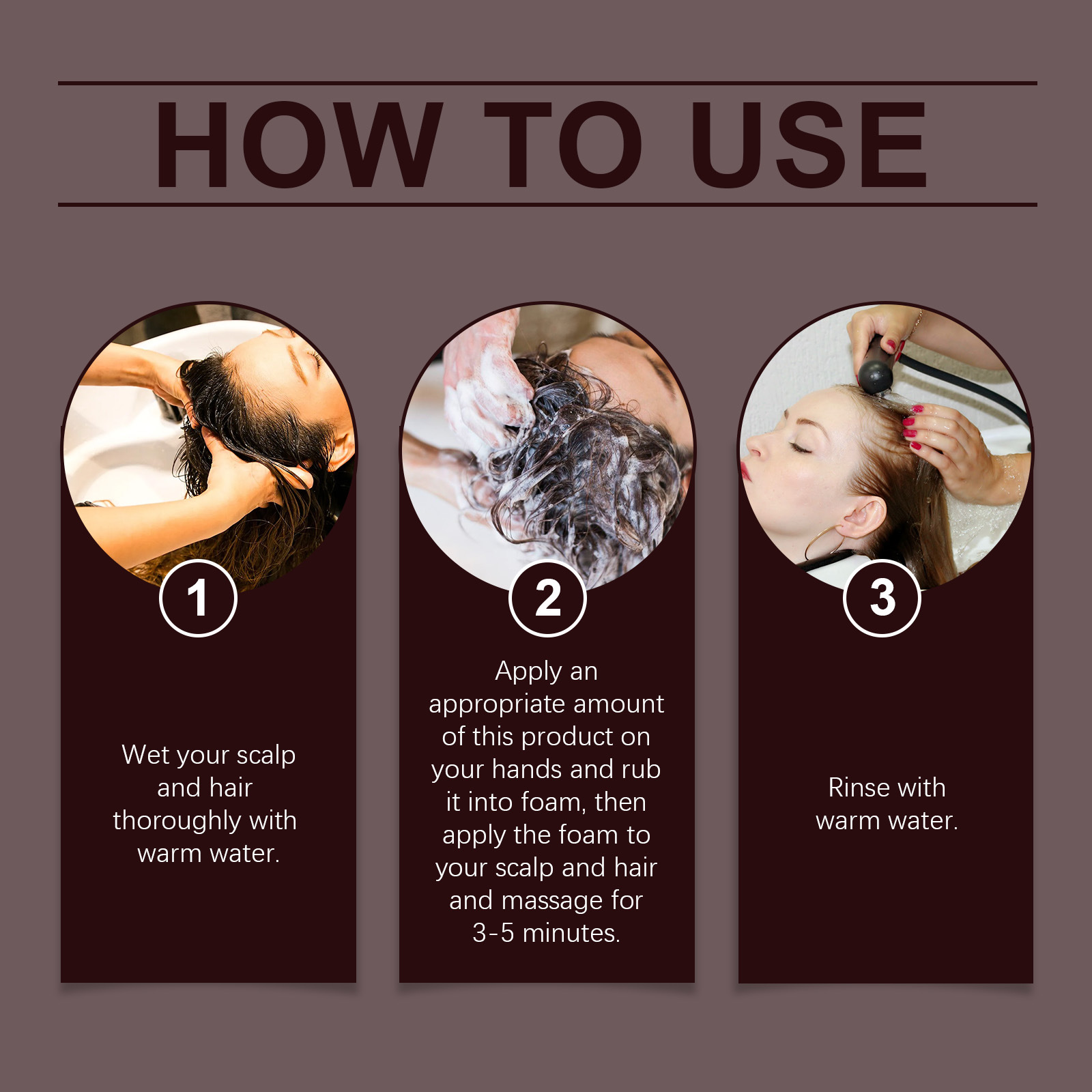 2. Apply an appropriate amount of this product on your hands and rub it into foam, then apply the foam to your scalp and hair and massage for 3-5 minutes.